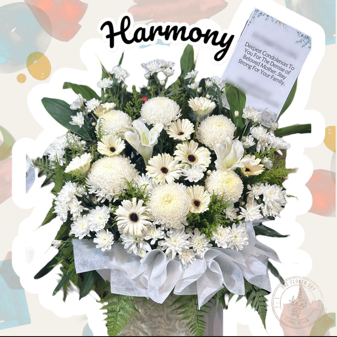 Offer a sincere expression of sympathy with "Harmony", featuring fresh, carefully arranged flowers. Designed to provide comfort and convey heartfelt condolences, this stand is ideal for funerals, memorials, or as a gesture of support to grieving families.